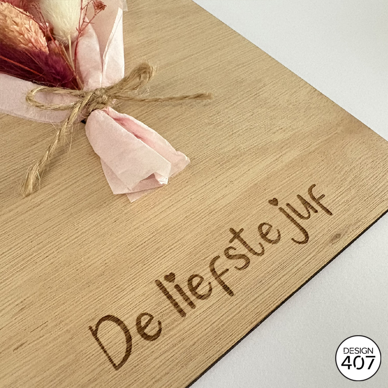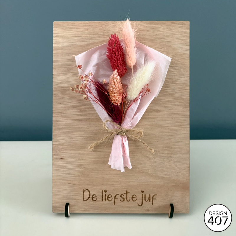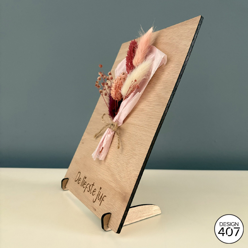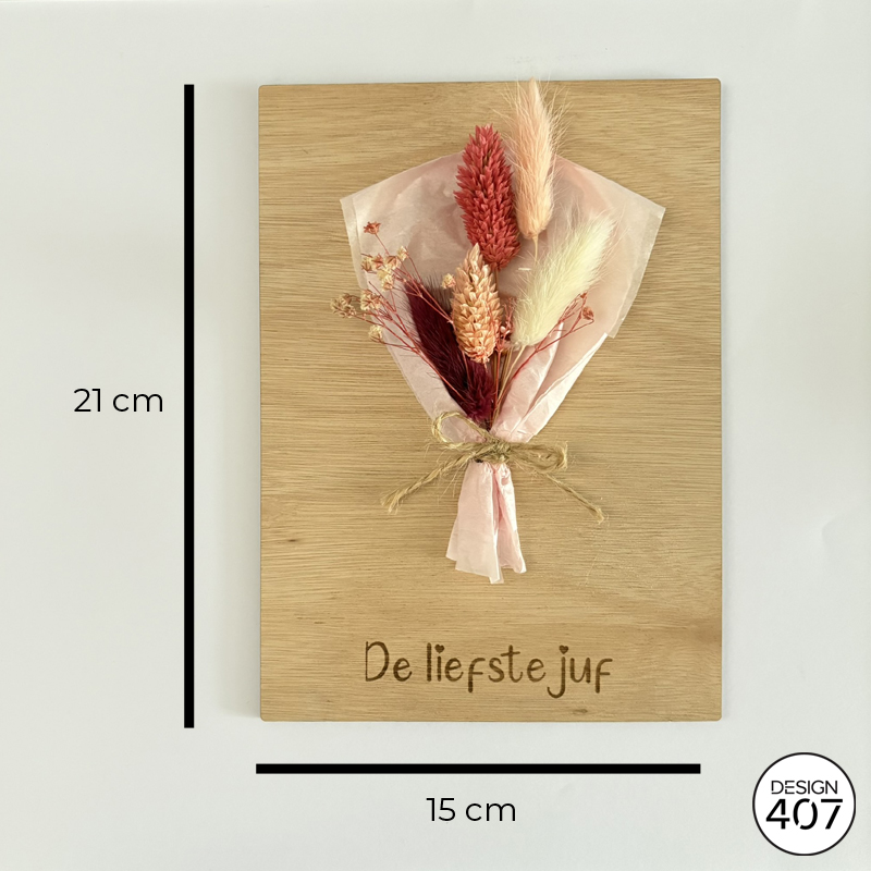 Houten bordje met een prachtig boeketje droogbloemen. Het bordje is 21 x 15 cm en wordt geleverd met 2 pootjes zodat het mooi kan blijven staan. Het droogboeketje is verkrijgbaar in verschillende varianten. Dit droogboeketje is hét perfecte cadeau om iemand mee te verrassen!