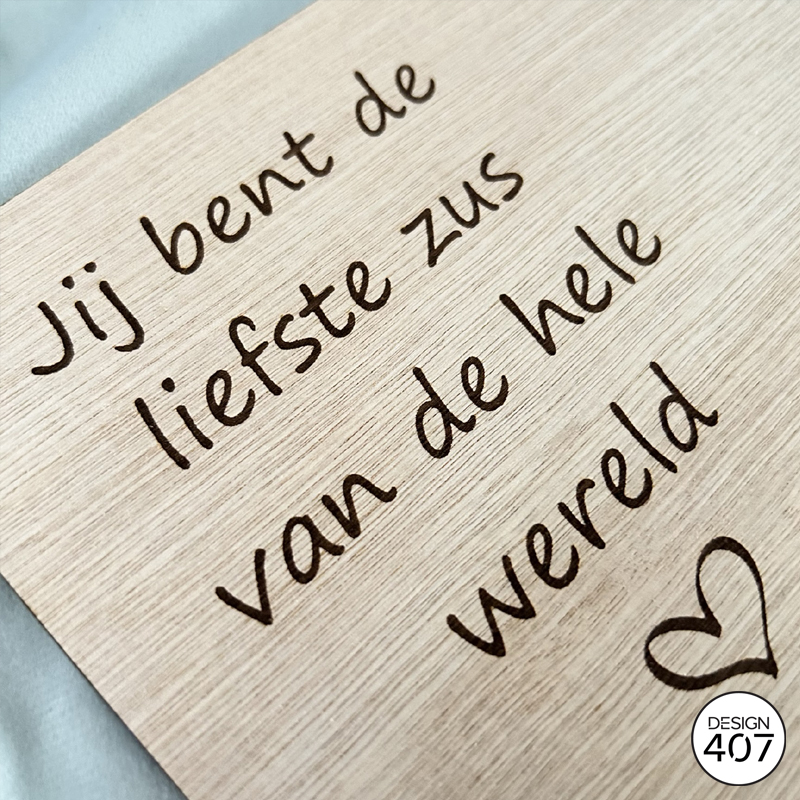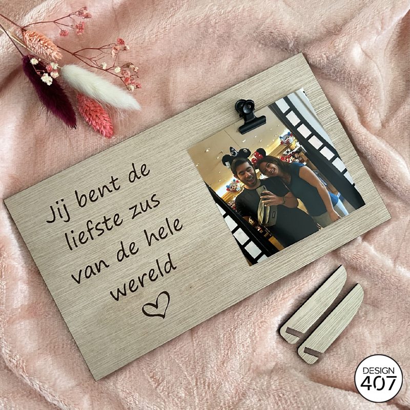 Verras jou zus met dit leuke houten plankje waar een leuke foto van jullie samen op past. Bij deze Foto Clip ontvang je ook 2 pootjes, waardoor het plankje makkelijk kan blijven staan. Op het plankje past een foto van 10 x 10cm, het plankje zelf is 24 x 14cm.