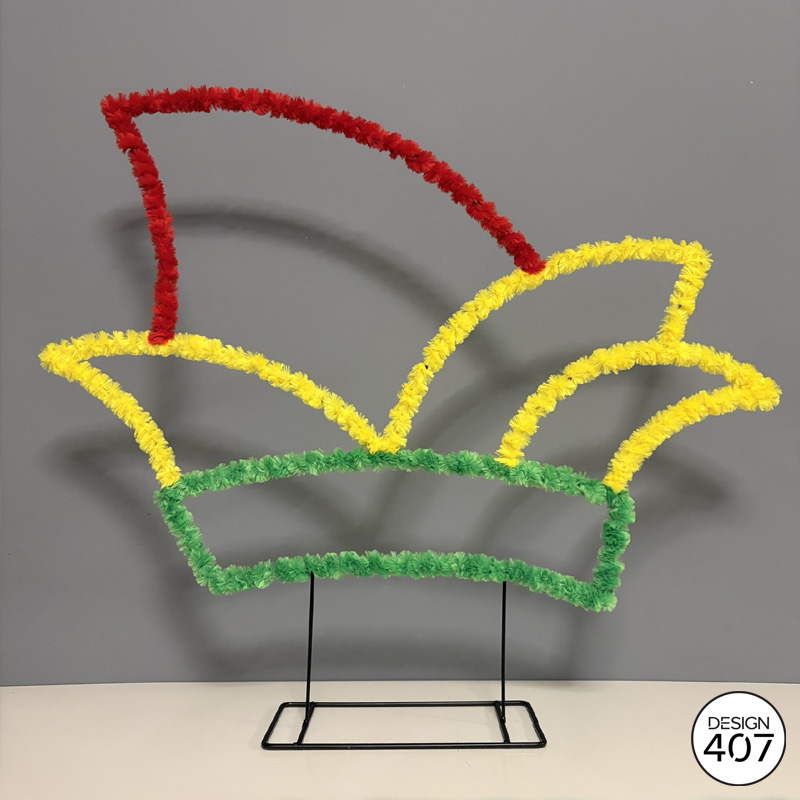 Zwart metalen frame in de vorm van een prinsensteek met poot. De prinsensteek is gedecoreerd met rood geel en groen, zodat je meteen de carnavalssfeer voelt! Het frame is 50 x 57 x 12 cm.