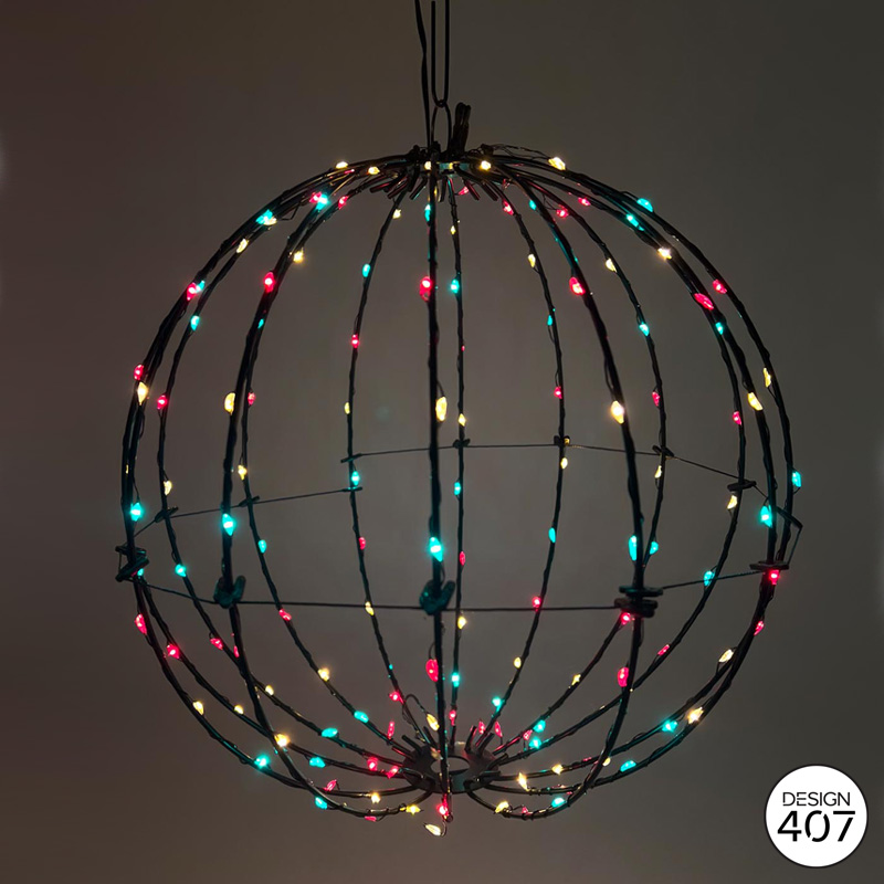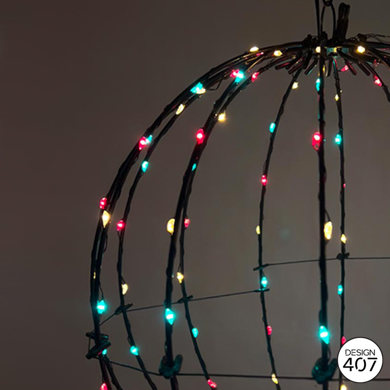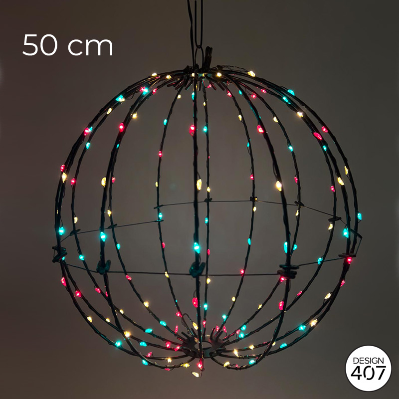 Lichtbol met rood, geel groene led-verlichting op een zwart metalen frame. De lichtbol heeft een doorsnede van 50cm en bevat 360 LED’s. Deze decoratieve lichtbol is de perfecte feestdecoratie voor elke ruimte of voor aan de vlaggenstok!