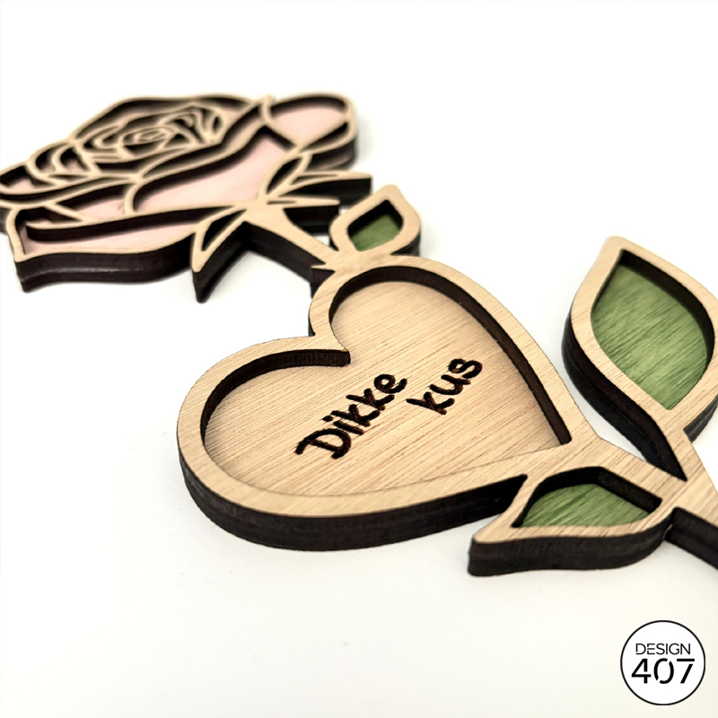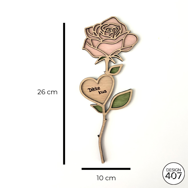 Prachtige houten roos met gekleurde tinten en een hartje met de tekst Dikke Kus. De roos is ongeveer 26 cm hoog en 10cm breed. De roos wordt geleverd inclusief vaasje en glazen steentjes.