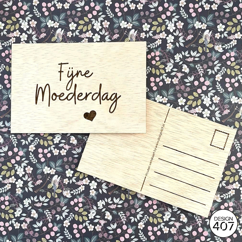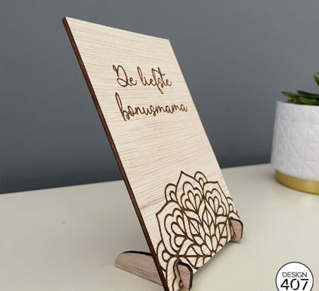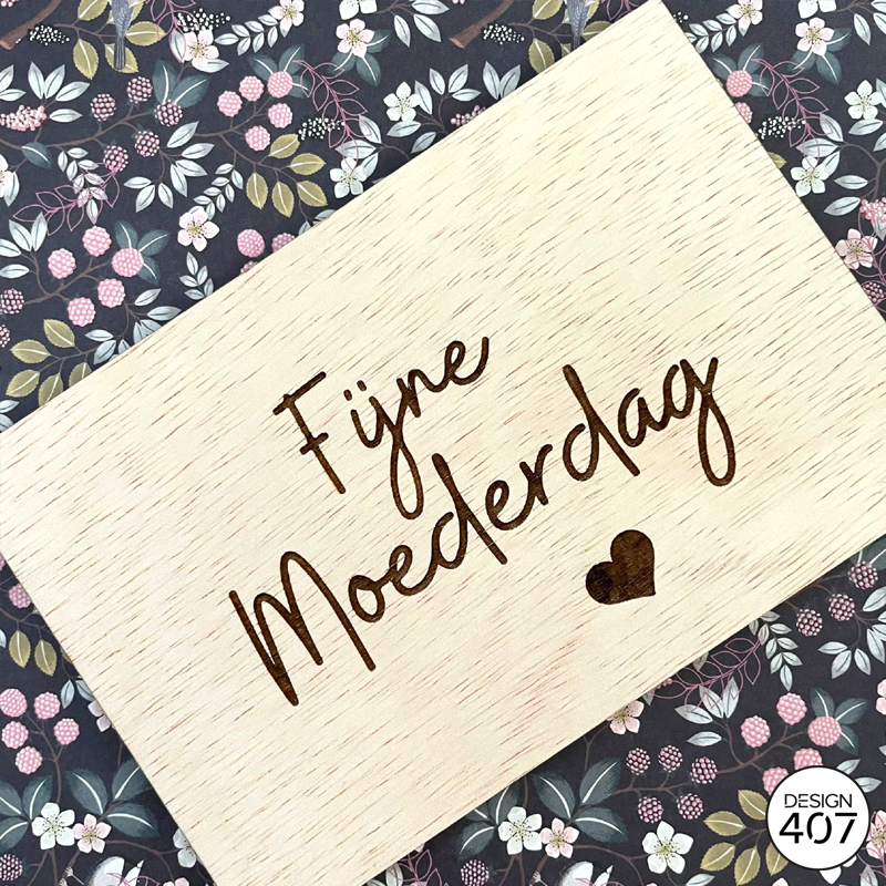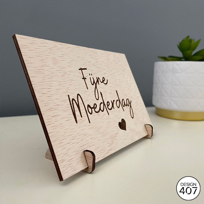 Prachtige houten wenskaart voor Moederdag. De achterzijde is gegraveerd als ansichtkaart, zodat je er een leuke boodschap op kunt schijven. Bij de wenskaart ontvang je 2 kleine standaardjes, zodat de kaart makkelijk kan blijven staan.